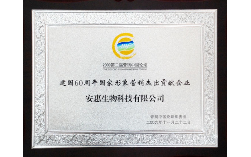 2009年11月22日,安惠公司榮獲“建國60周年國家形象營銷杰出貢獻(xiàn)企業(yè)”稱號。