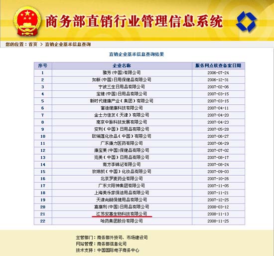 2008年11月13日,從商務部直銷行業(yè)管理信息系統(tǒng)傳出信息:江蘇安惠生物科技有限公司獲得中華人民共和國直銷經(jīng)營許可,并已完成服務網(wǎng)點核查備案。安惠公司將依法在獲得批準的直銷區(qū)域開展直銷經(jīng)營活動。