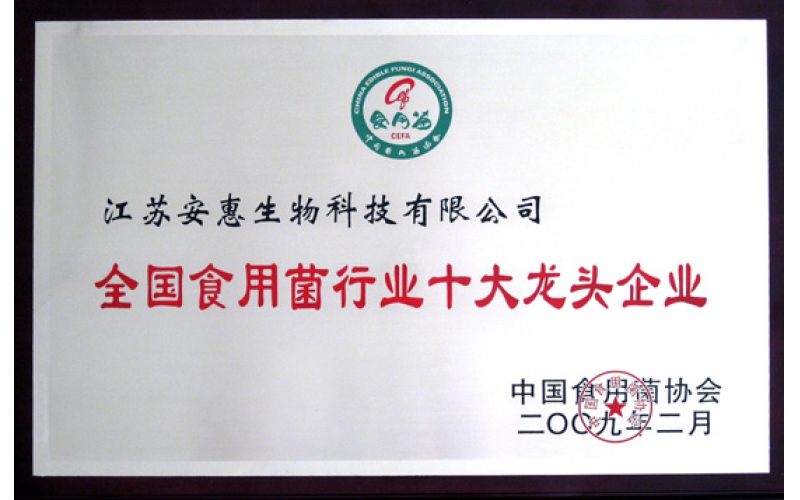 2009年2月25日,在中國食用菌協(xié)會第四屆第四次常務理事(擴大)會議上,安惠公司被授予“全國食用菌行業(yè)十大龍頭企業(yè)”稱號。