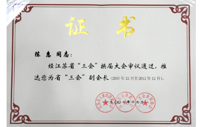 2007年12月,陳惠董事長當選“三會”(江蘇省工業經濟聯合會、江蘇省企業聯合會、江蘇省企業家協會)副會長。