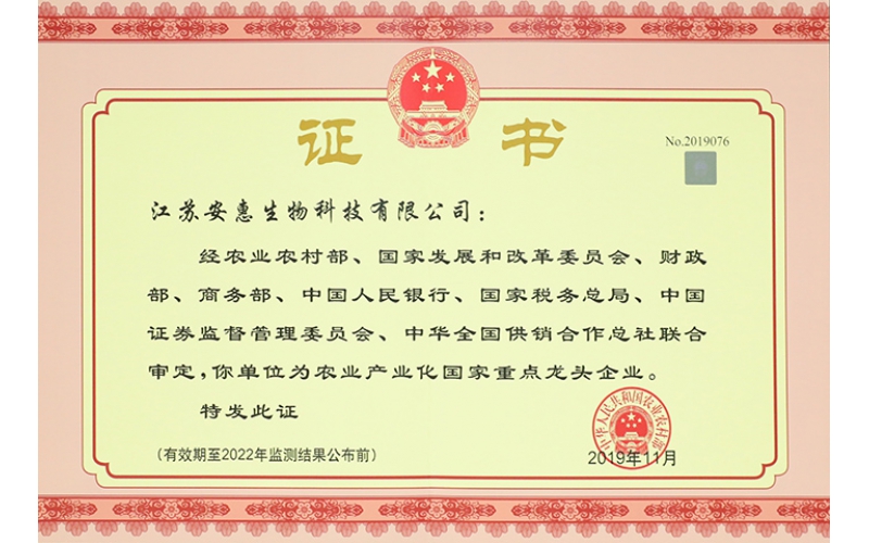 2019年12月,經(jīng)各省(區(qū)、市)遴選推薦、嚴格把關(guān),專家評審和全國農(nóng)業(yè)產(chǎn)業(yè)化聯(lián)席會議審定,農(nóng)業(yè)農(nóng)村部公布了第六批300家農(nóng)業(yè)產(chǎn)業(yè)化國家重點龍頭企業(yè)名單,江蘇安惠生物科技有限公司榜上有名。